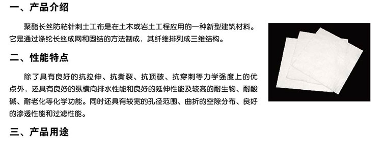 長(zhǎng)絲土工布為聚酯長(zhǎng)絲針刺無(wú)紡?fù)凉げ,不含化學(xué)添加劑,也不經(jīng)熱處理,是環(huán)保型的建筑材料。