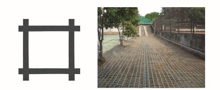 鋼塑復(fù)合土工格柵是用聚丙烯、聚氯乙烯等高分子聚合物經(jīng)熱塑或模壓而成的二維網(wǎng)格狀或具有一定高度的三維立體網(wǎng)格屏柵。由于塑料土工格柵在制造中聚合物的高分子會(huì)隨加熱延伸過程而重新排列定向,加強(qiáng)了分子鏈間的聯(lián)結(jié)力,達(dá)到了提高其強(qiáng)度的目的。其延伸率只有原板材的10%~15%。如果在土工格柵中加入炭黑等抗老化材料,可使其具有較好的耐酸、耐堿、耐腐蝕和抗老化等耐久性能。